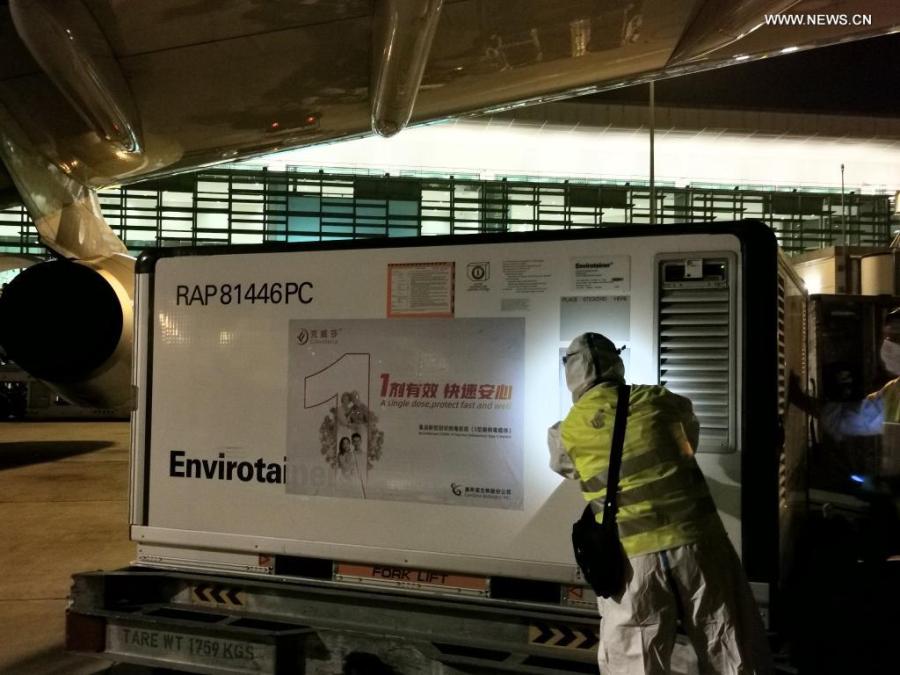 Workers unload CanSino COVID-19 vaccines at Islamabad International Airport in Islamabad, Pakistan, on March 30, 2021. The first batch of CanSino COVID-19 vaccines that the Pakistani government purchased from China arrived here Tuesday night. (Str/Xinhua)