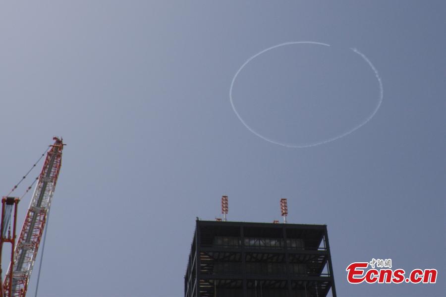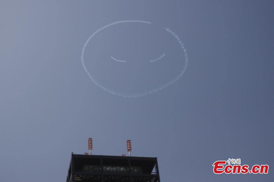 A Japanese stunt pilot draws a smiling face in the sky in Tokyo, Japan, March 31, 2021. (Photo/VCG)