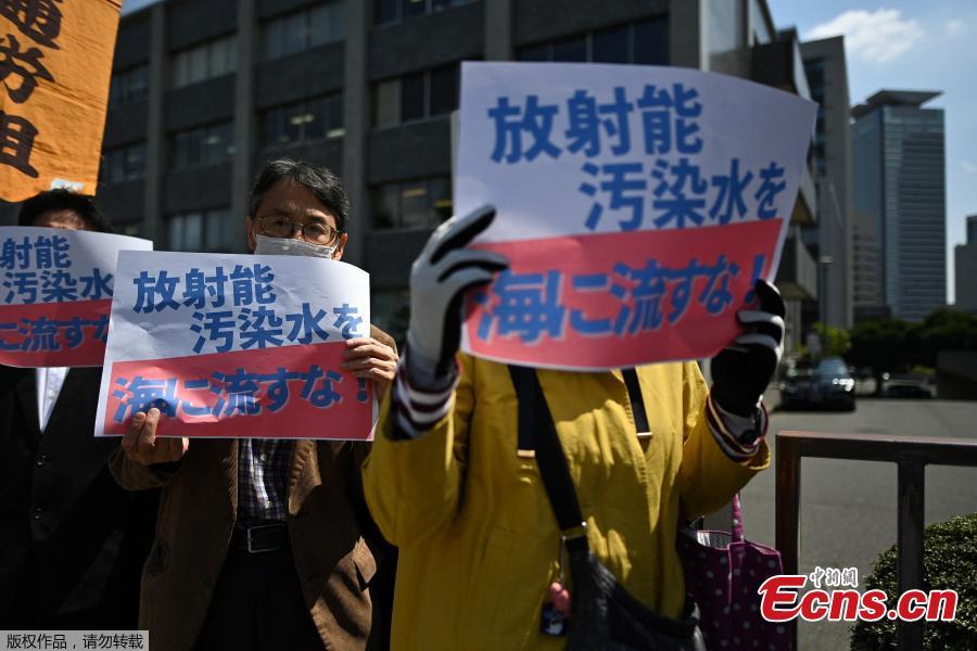 People hold banners during a demonstration against disposing the radioactive wastewater from the crippled Fukushima Daiichi Nuclear Power Plant into the Pacific Ocean in front of Japanese Prime Minister's office in Tokyo, Japan, April 12, 2021. (Photo/Agencies)