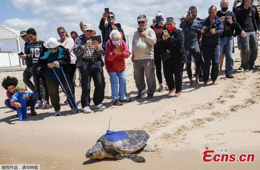 Onlookers watch as a loggerhead sea turtle equipped with a GPS tracker is released back into the Mediterranean Sea at Nitzanim beach near the Israeli city of Ashkelon, April 12, 2021. Kfir, a 30-kilogramme wounded female green sea turtle was released into the Mediterranean after receiving treatment at the Israeli Sea Turtle Rescue Center. (Photo/Agencies)