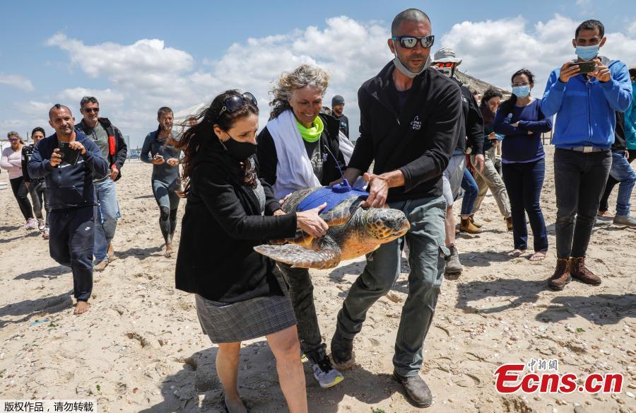 A loggerhead sea turtle equipped with a GPS tracker is carried by staff of the Israeli Sea Turtle Rescue Centre to be released to the Mediterranean Sea at Nitzanim beach near the Israeli city of Ashkelon, April 12, 2021.Kfir, a 30-kilogramme wounded female green sea turtle was released into the Mediterranean after receiving treatment at the Israeli Sea Turtle Rescue Center. (Photo/Agencies)
