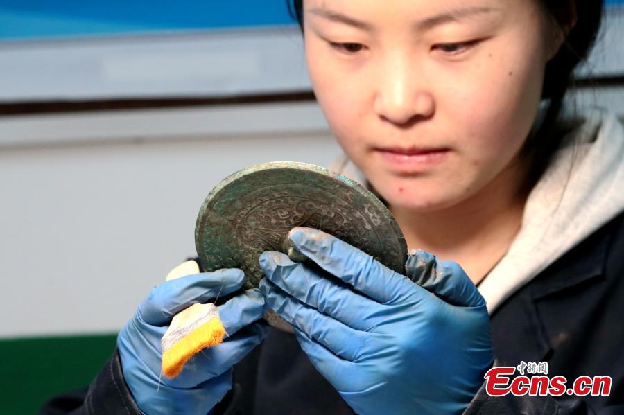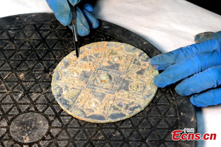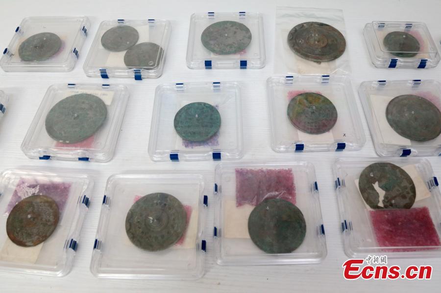 Archaeologists from the Shaanxi Provincial Institute of Archaeology have unearthed more than 80 bronze mirrors from the Western Han Dynasty (202 BC-9 AD) at a large cemetery in Dabaozi Village, Xianyang City, Shaanxi Province. Some of these bronze mirrors are well preserved and ornamented. After cleaning and repairing, they are still light and enable to reflect images. (Photo: China News Service/Zhang Yuan)