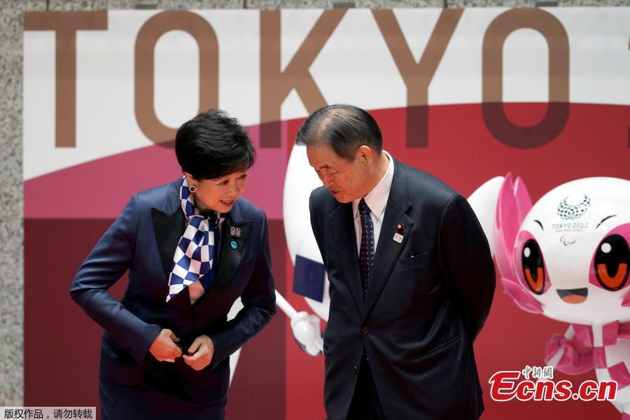 Tokyo Governor Yuriko Koike and Tokyo 2020 organizing committee Vice-president Toshiaki Endo speak during the unveiling event for the statues of Miraitowa and Someity, the official mascots for the Tokyo 2020 Olympics and Paralympics, as they mark 100 days before the start of the Olympic Games Tokyo 2020 at the Tokyo Metropolitan Government building, in Tokyo, Japan, April 14, 2021. (Photo/Agencies)