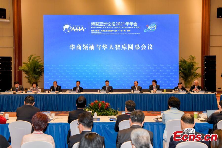 A session titled “Overseas Chinese CEO and Think Tank Roundtable” is held during the Boao Forum for Asia Annual Conference 2021 in Boao, south China's Hainan Province on April 19, 2021. (China News Service/Luo Yunfei)