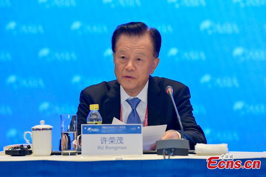 Xu Rongmao, Vice Chairman of China Overseas Friendship Association(COFA), speaks at a session titled “Overseas Chinese CEO and Think Tank Roundtable” during the Boao Forum for Asia Annual Conference 2021 in Boao, south China's Hainan Province on April 19, 2021. (China News Service/Luo Yunfei)