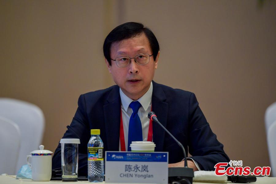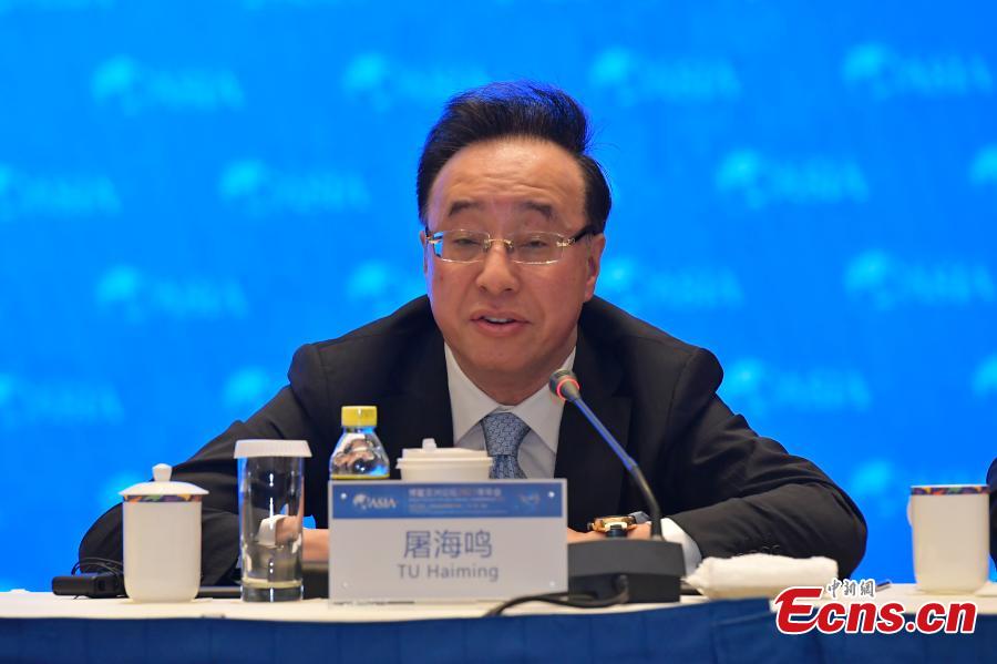 Pan Yue, director of the Overseas Chinese Affairs Office of the State Council of China, speaks at a session titled “Overseas Chinese CEO and Think Tank Roundtable” during the Boao Forum for Asia Annual Conference 2021 in Boao, south China's Hainan Province on April 19, 2021. (China News Service/Luo Yunfei)