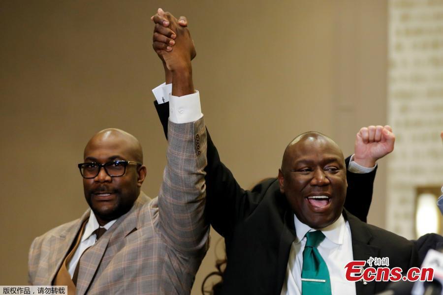 Floyd family attorney Ben Crump and Philonise Floyd raise their fists during a news conference following the verdict in the trial of former Minneapolis police officer Derek Chauvin, found guilty of the death of George Floyd, in Minneapolis, Minnesota, U.S., April 20, 2021. Chauvin was charged with second-degree murder and second-degree manslaughter, maximam sentence up to 40 years, 25 years and 10 years, respectively. Those sentences would likely be served concurrently, not consecutively. (Photo/Agencies)