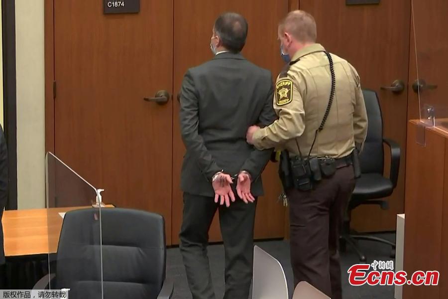 Former Minneapolis police officer Derek Chauvin is led away in handcuffs after a jury found him guilty of murder and manslaughter in the May 25, 2020 death of George Floyd in Minneapolis, Minnesota, U.S. April 20, 2021. Chauvin was charged with second-degree murder and second-degree manslaughter, maximam sentence up to 40 years, 25 years and 10 years, respectively. Those sentences would likely be served concurrently, not consecutively.(Photo/Agencies)