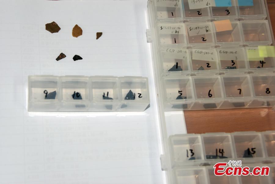 Specimens of broken fossilized dinosaur egg shells are seen at the Institute of Vertebrate Paleontology and Paleoanthropology (IVPP), Chinese Academy of Sciences (CAS), April 20, 2021. These shells have little difference from eggshell fragments found in the Nanxiong Basin of Guangdong and are an analogous to egg shells of maiasaura. It is estimated its mother belongs to the specie of Hadrosaurids, duck-billed dinosaurs, a latest research indicates. (Photo/Provided to China News Service by IVPP)