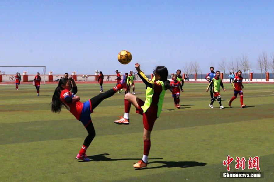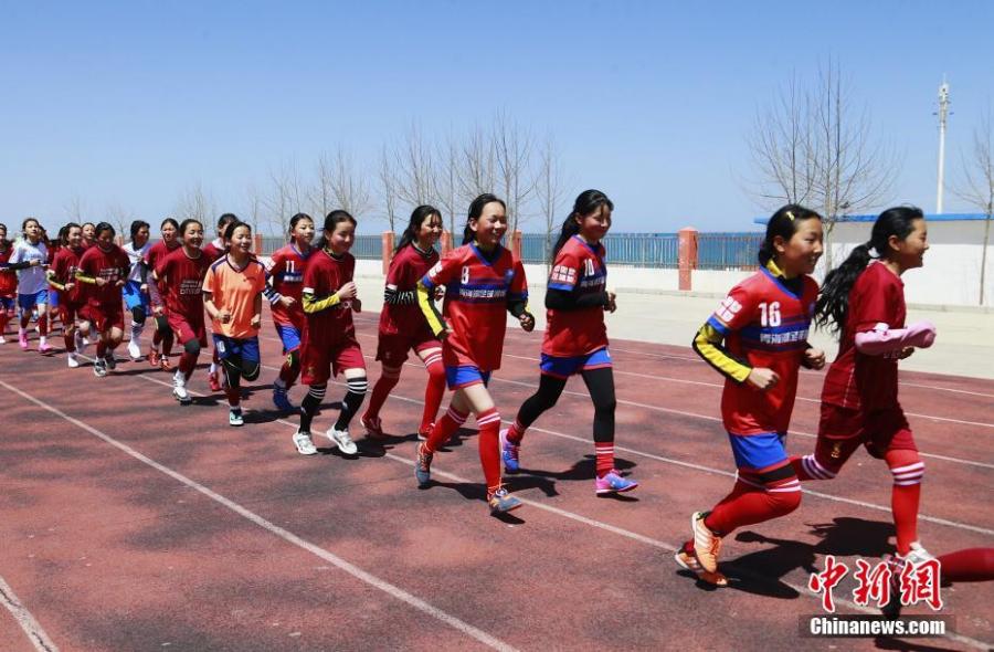 Teenage female football players are training at the playground of a boarding school in Gonghe County, Hainan Tibetan Autonomous Prefecture, northwest China’s Qinghai Province, April 21, 2021. The school has a 53-membered female football team that is divided into two age groups. All of the teen players are Tibetan girls from pastoral areas.(China News Service/Ma Mingyan)