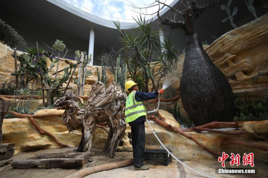 A staff member is watering a baobab tree planted at China Flower Expo park on April 21, 2021. The 10th China Flower Expo, China’s largest flower event this year, will take place on Shanghai's Chongming Island starting from May 21. (China News Service/Zhang Hengwei)