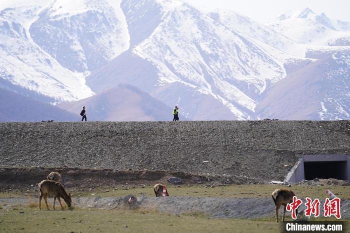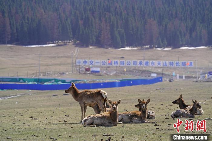 The Tianshan wapiti (Cervus elaphus songaricus) forage on the grassland along the G575 East Tianshan Tunnel in Hami,northwest China’s Xinjiang Uygur Autonomous Region. (China News Service/Cao Xinjia)