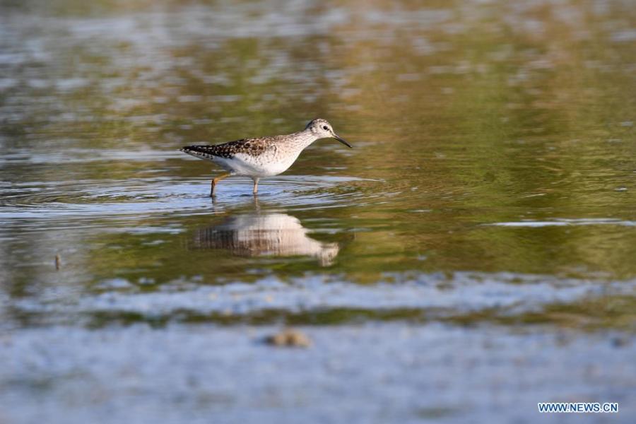 A flock of sharp-tailed sandpipers forage in the Minjiang River estuary nature reserve in southeast China's Fujian Province, April 20, 2021.