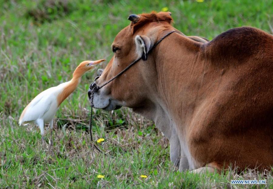A cattle egret forages in the Minjiang River estuary nature reserve in southeast China's Fujian Province, April 20, 2021.