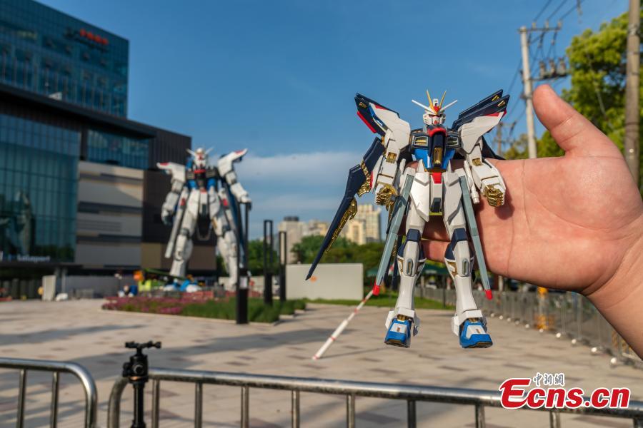 Photo shows the life-sized Gundam Freedom statue installed successfully in Shanghai, April 26, 2021. (Photo/China News Service)