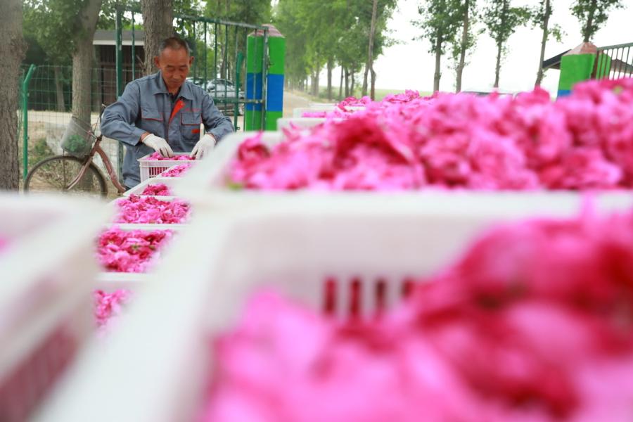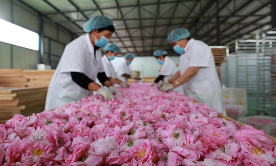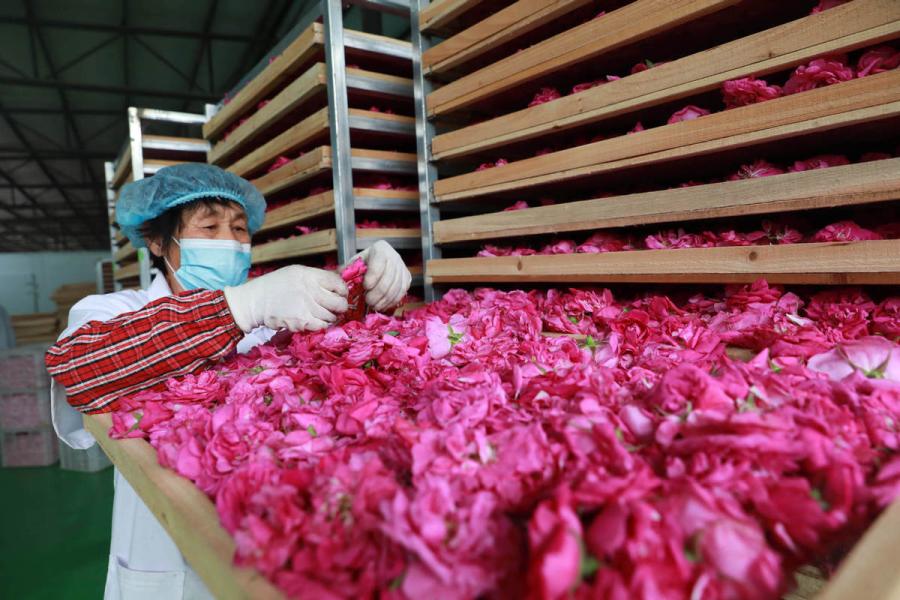 Staff members select roses for drying at a rose industrial park in Renze district, Xingtai city, North China's Hebei province, on May 14, 2021. The district adjusted rural industrial structure, introduced featured rose projects in recent years, and formed an integrated industrial chain of rose planting, processing, and sales. The "company plus rose base plus farmers" mode has boosted farmers' income as well as promoted rural revitalization of local areas. (Photo/Xinhua)