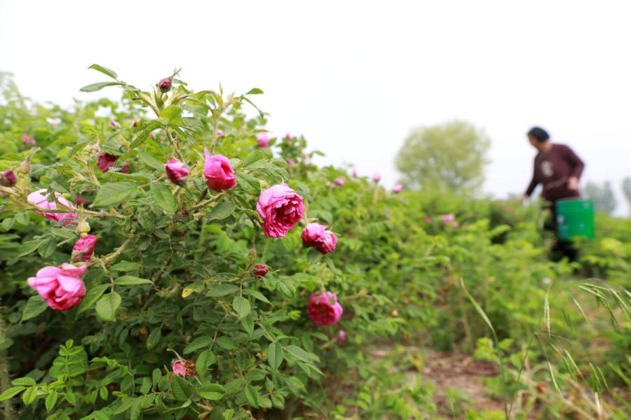 A worker picks roses at an industrial park in Xingtai, Hebei province, on May 14, 2021. (Photo/Xinhua)
