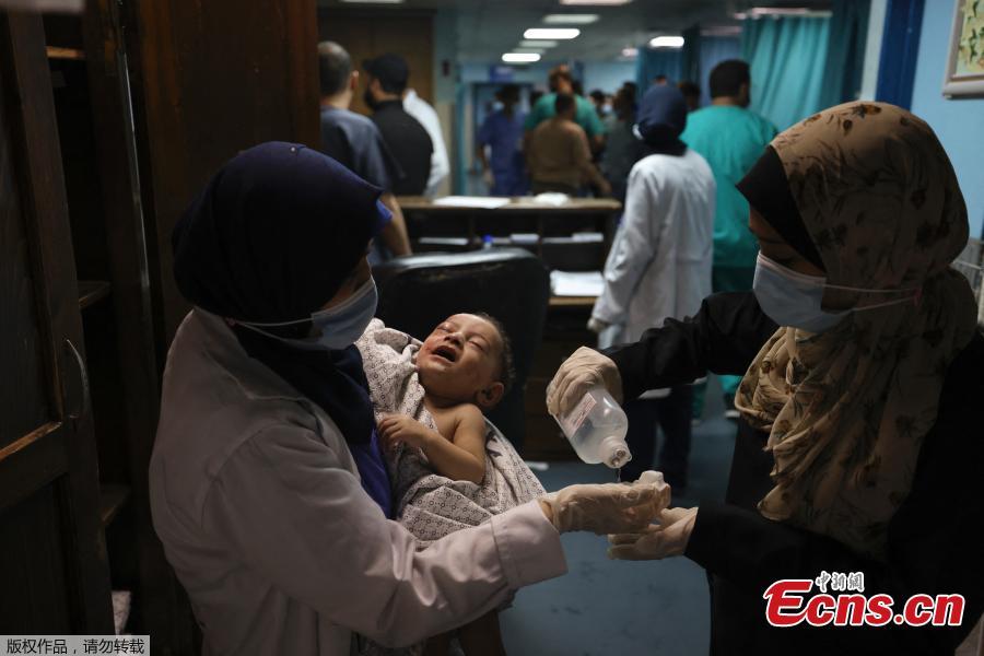 A nurse holds a baby, who was pulled alive from under the rubble while seven other family members perished, at Al-Shifa Hospital, after an Israeli air strike struck al-Shati Refugee Camp without advance warning during the night, Gaza City, May 15, 2021. (Photo/Agencies)