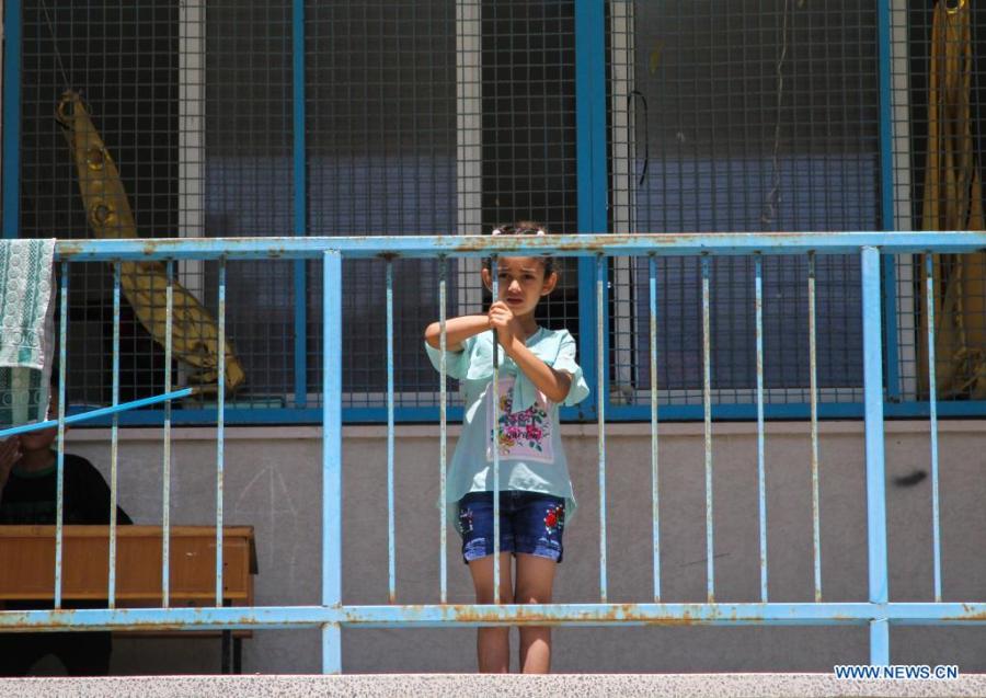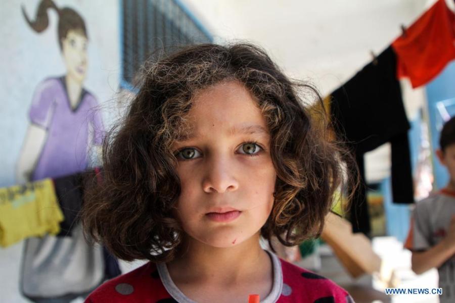 Palestinian girl Jaleya Al-Attar poses for a photo at a school in Gaza City, on May 19, 2021. She fled her home after it was damaged during Israeli air strikes, and took refuge at the school as many other Palestinians. (Xinhua/Rizek Abdeljawad)