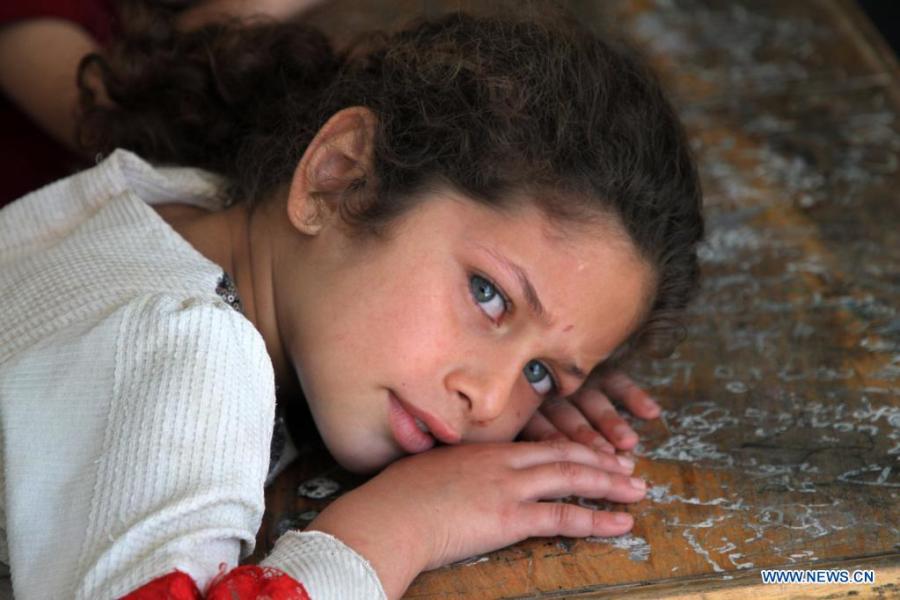 Palestinian girl Sama Al-Sultan poses for a photo at a school in Gaza City, on May 19, 2021. Al-Sultan, 5 years old, who fled her home after it was damaged during Israeli air strikes, takes refuge at the school as many other Palestinians. (Xinhua/Rizek Abdeljawad)