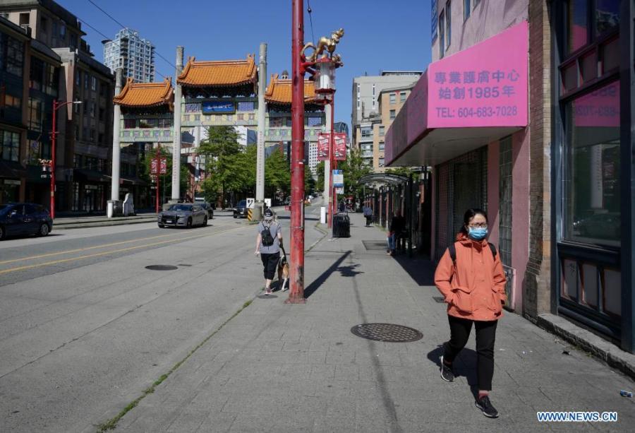 People walk along a street in Chinatown, Vancouver, British Columbia, Canada, on May 20, 2021. After suffering from the COVID-19 pandemic for over a year, businesses in Chinatown, one of the tourist attractions in Vancouver, are calling for help to bring back visitors. (Photo by Liang Sen/Xinhua)