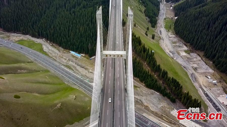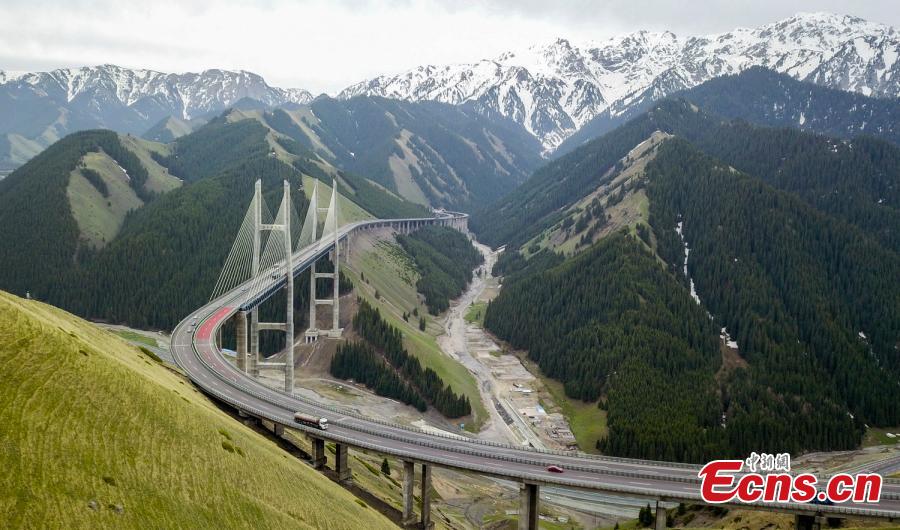 The aerial photo taken on May 17 shows the magnificent landscape of the Guozigou Bridge in Ili, Xinjiang Uygur Autonomous Region. (Photo/Liu Xin)