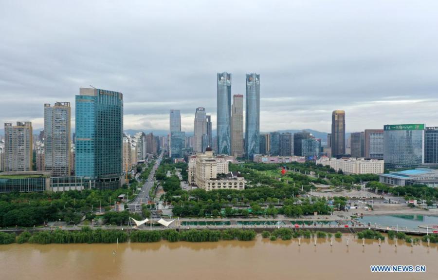 Aerial photo taken on May 23, 2021 shows a shoal nearly submerged in the Ganjiang River in Nanchang, east China's Jiangxi Province. Water level of Ganjiang River has been rising due to the torrential rain. (Xinhua/Peng Zhaozhi)