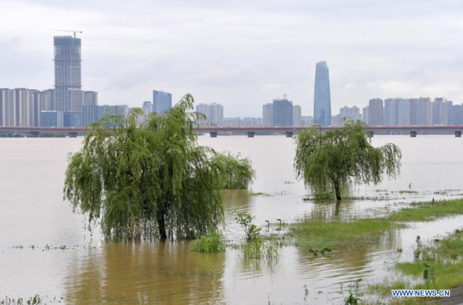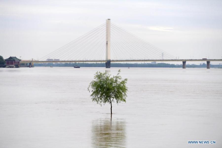 Photo taken on May 23, 2021 shows a tree immersed in water in the Ganjiang River in Nanchang, east China's Jiangxi Province. Water level of Ganjiang River has been rising due to the torrential rain. (Xinhua/Peng Zhaozhi)