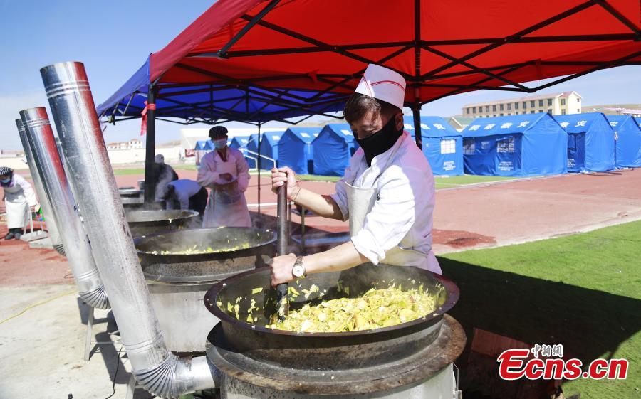 Cooks are preparing lunch for students at Maduo County of Golog Tibetan Autonomous Prefecture, northwest China's Qinghai Province, May 24, 2021.