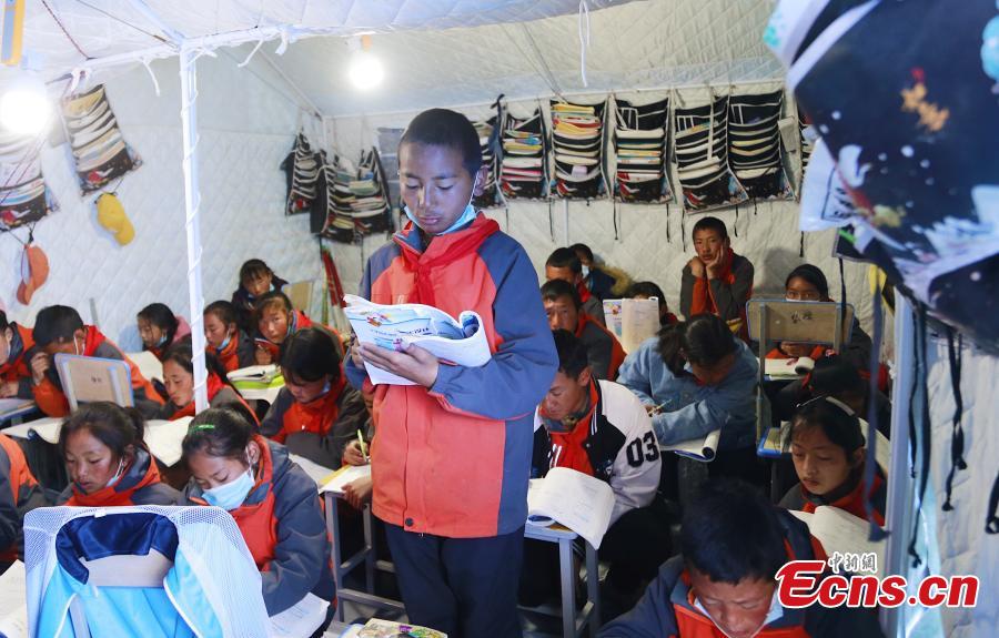 A student is reading a text during a lesson at a tent at Maduo County of Golog Tibetan Autonomous Prefecture, northwest China's Qinghai Province, May 24, 2021.