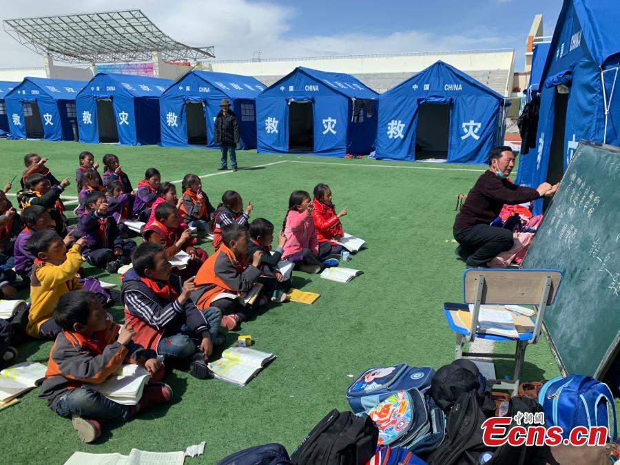 A 7.4-magnitude earthquake hit Maduo County at 2:04 a.m. Saturday BJT. As of 8 a.m. on Monday, one injured person was hospitalized after 17 out of 18 were discharged from hospital. Many tents were set up for students as temporary learning sites and all middle schools and primary school students in the county have classes on Monday. (China News Service/Ma Mingyan)