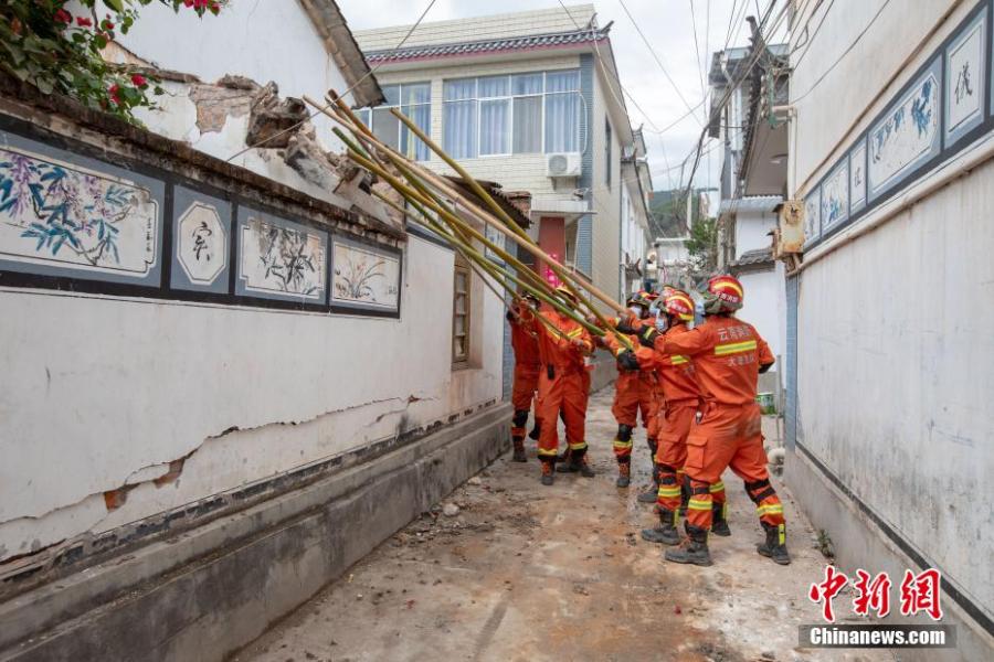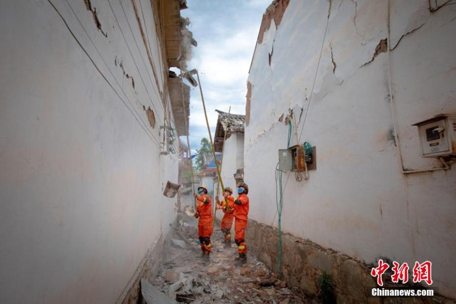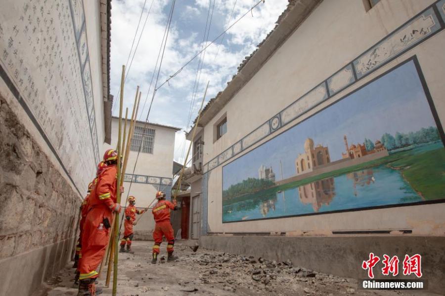 A team of firefighters check and remove potential hazards in damaged houses after an earthquake hit Yangbi Yi Autonomous County, southwest China's Yunnan Province, May 25, 2021. (China News Service/Wang Yang)