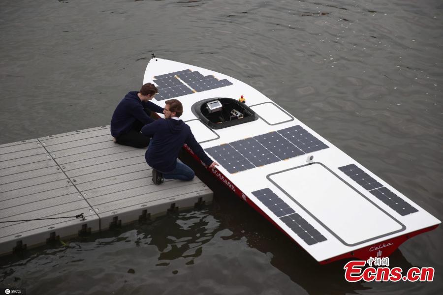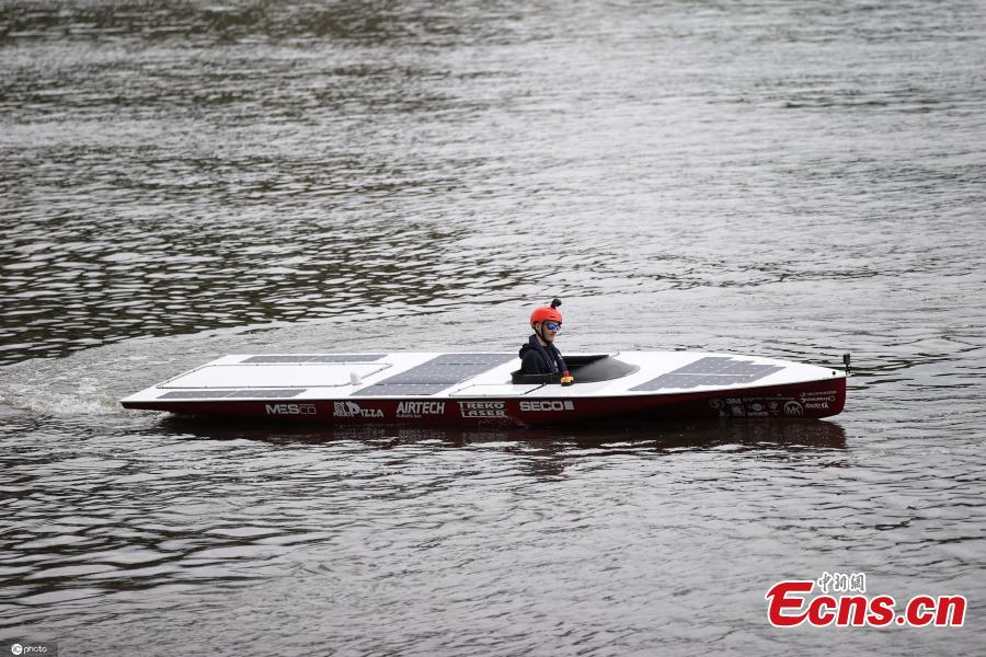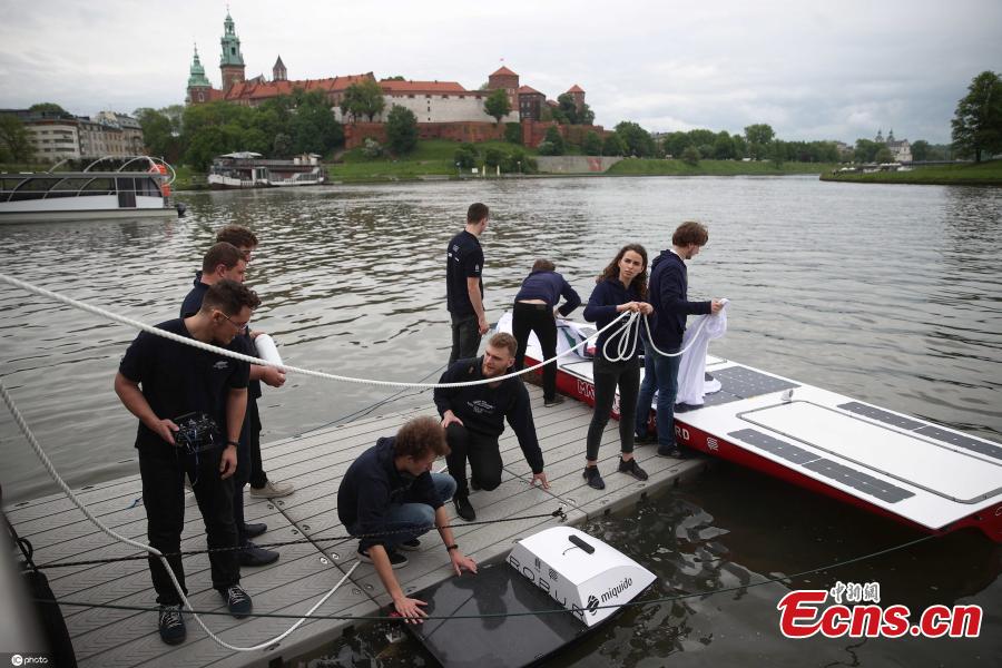 A solar boat newly developed by a solar boat team of AGH University of Science and Technology is put for trial on the water, Krakow, Poland, May 25, 2021. The students of the team aim to build a zero-emission racing boat powered by 100% renewable solar energy. (Photo/IC)