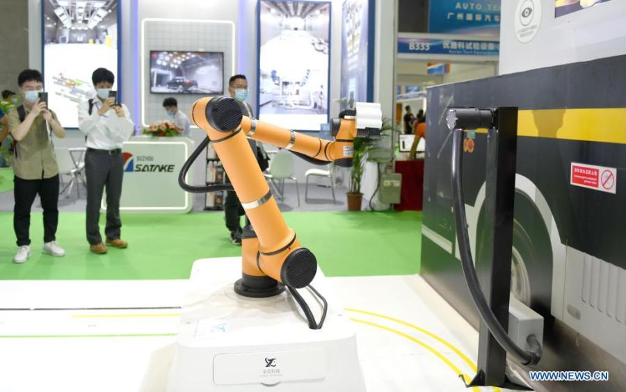 Purchasers watch an automotive charging robot working during the China Guangzhou International Automotive Technology Expo 2021 in Guangzhou, south China's Guangdong Province, May 25, 2021. The expo opened here on Tuesday. (Xinhua/Lu Hanxin)