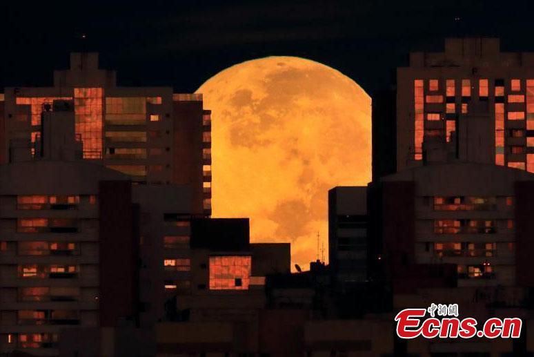 A super blood moon and lunar eclipse is seen between buildings of Brasilia, the capital of Brazil, May 26,2021. (Photo/Agencies)