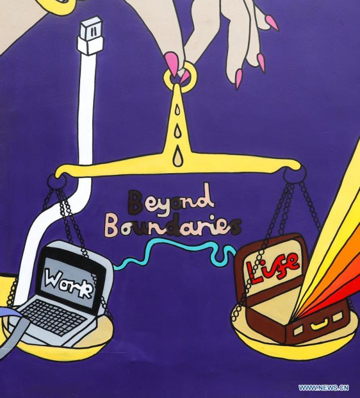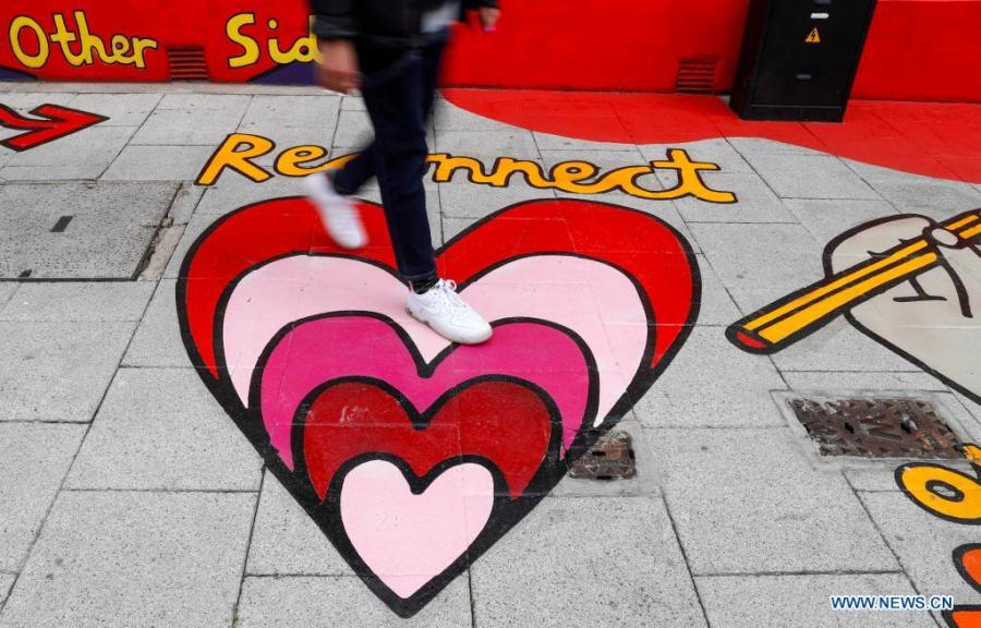 Photo taken on May 26, 2021 shows the artwork "He(art) is Everywhere" near Tate Modern in London, Britain. New artworks of the project "Beyond Boundaries" unveiled near Tate Modern. The artworks are aimed at reconnecting people with each other. (Xinhua/Han Yan)