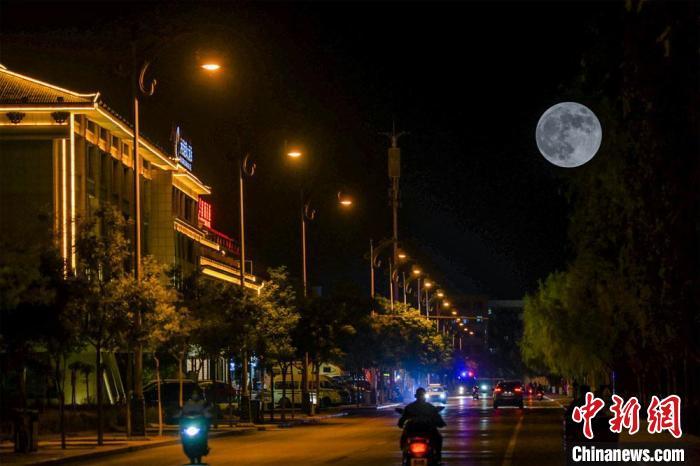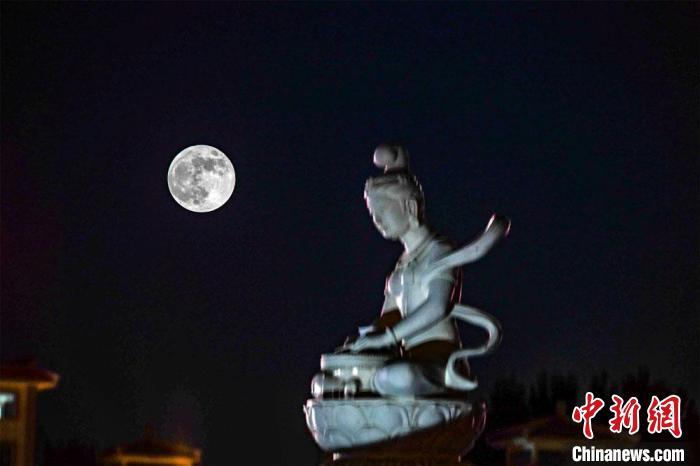 The double-exposure photo shows a supermoon hangs over the Danghe River in Dunhuang City, northwest China's Gansu Province, May 26, 2021. The city, a major stop on the ancient Silk Road, has a splendid 2,000-year trade history. (China News Service/Wang Binyin)