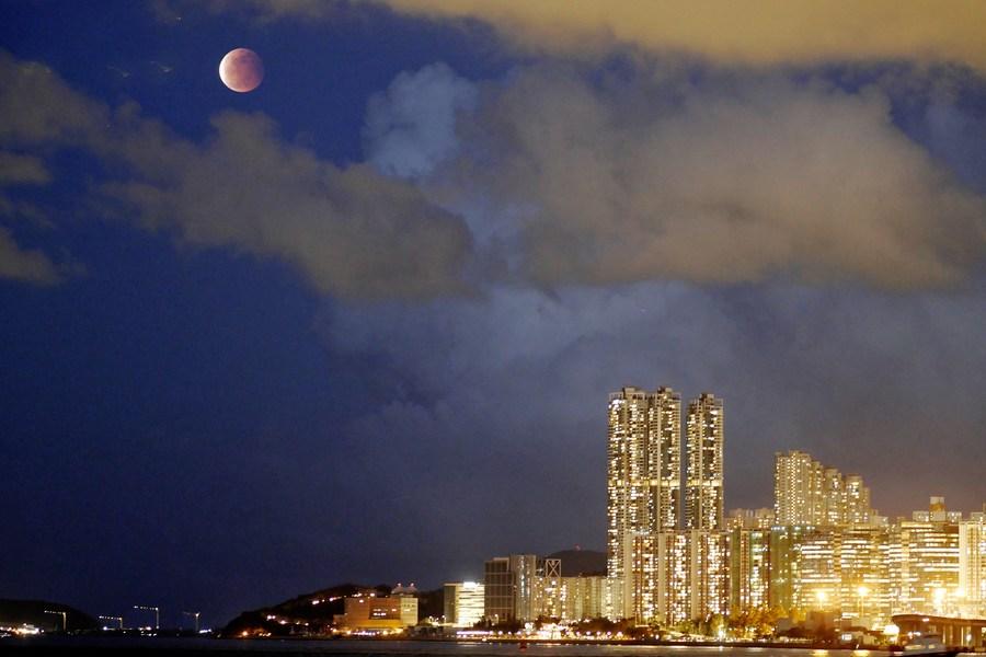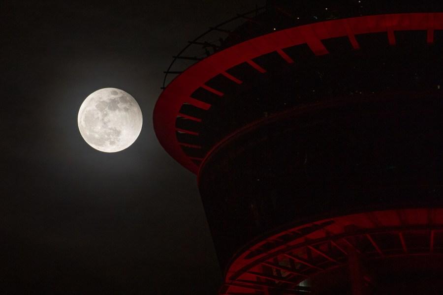 A multi-exposured image shows a Super Blood Moon during the total lunar eclipse in Christchurch, New Zealand, May 26, 2021. (Photo by Sun Xiaotong/Xinhua)