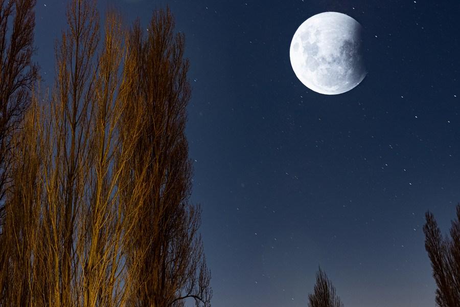 A moon is seen in the sky at Lake Wanaka, New Zealand, May 26, 2021. (Photo by Zhang Jianyong/Xinhua)