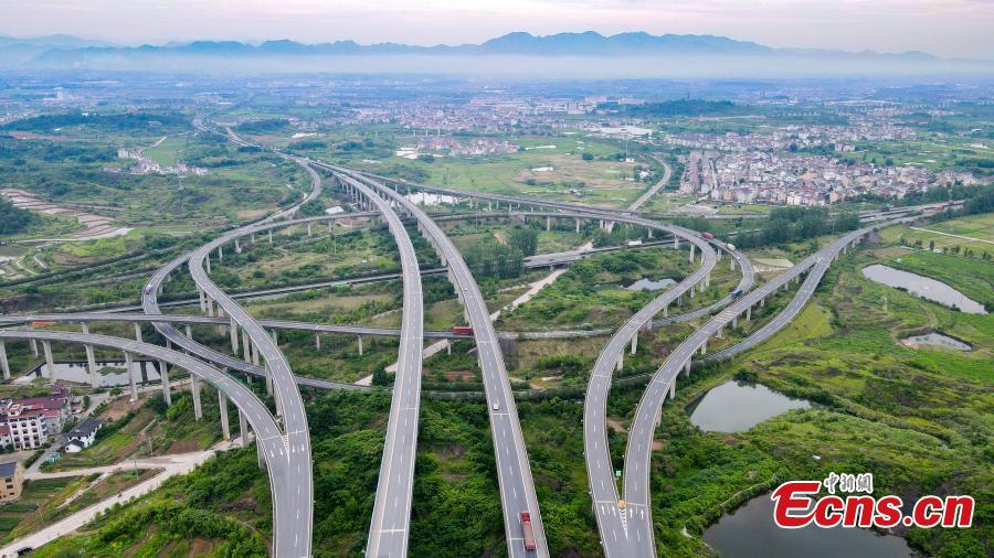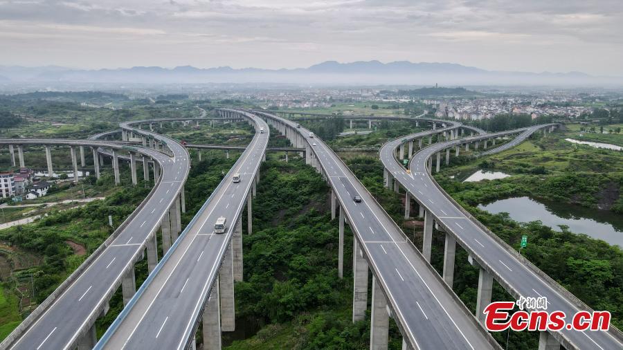 The aerial photo taken on May 26, 2021 shows the Huailu hub of the Zhuyong Expressway in east China’s Zhejiang Province. It stretches 8,947 meters in length, with a total investment of 420 million yuan (near 66 million U.S. dollars). (China News Service/Hu Xiaofei)