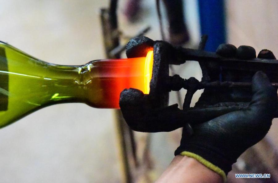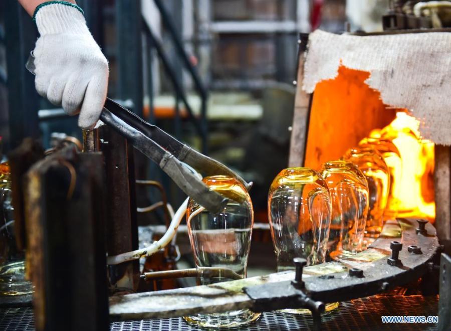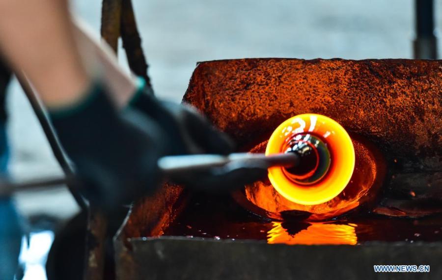 A worker makes glassware in Qixian County, north China's Shanxi Province, May 26, 2021. Glassware made in Qixian County has been exported to over 80 countries and regions. (Xinhua/Chai Ting)