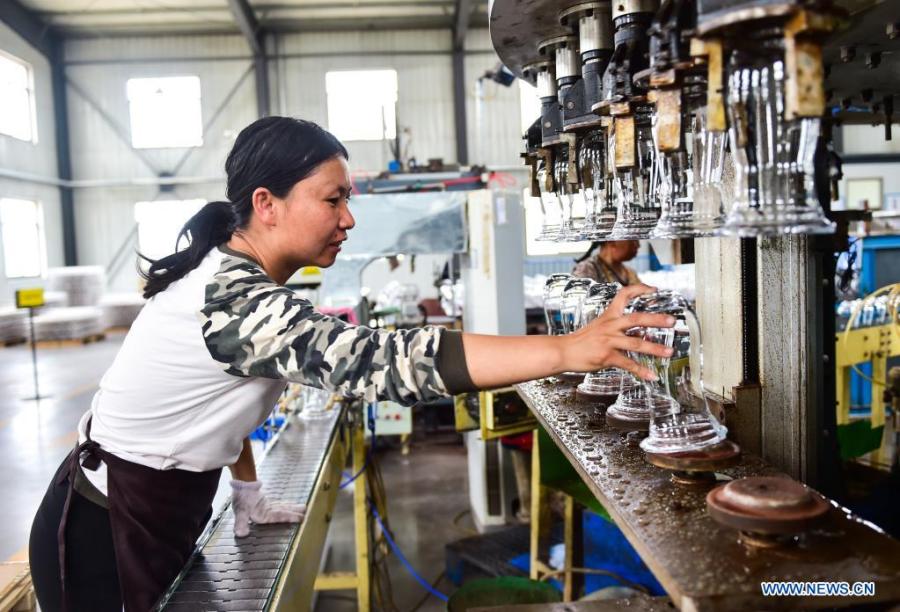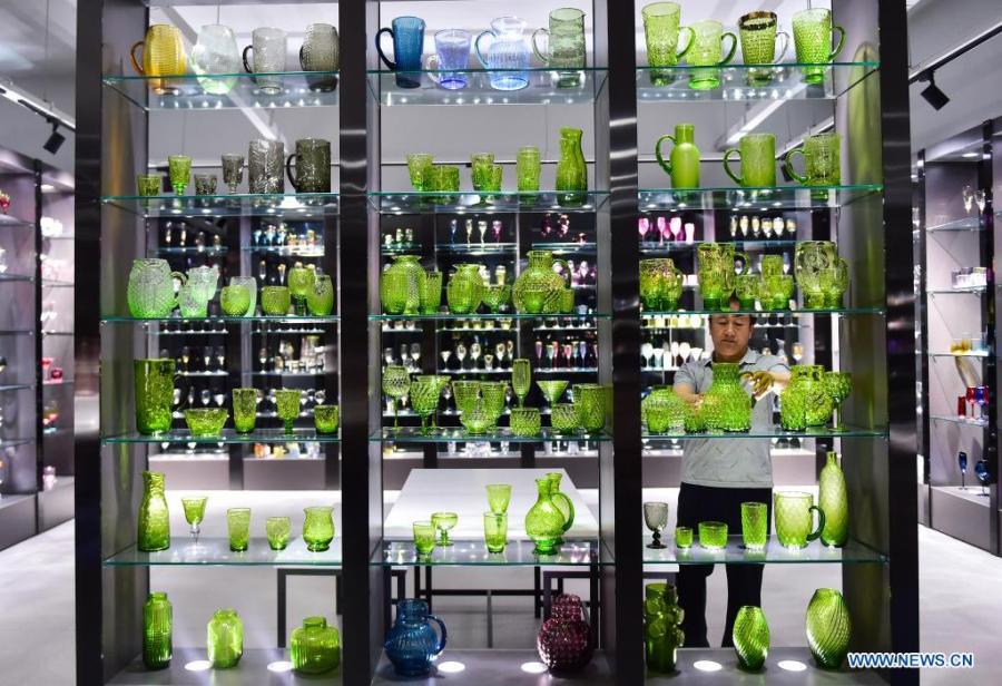 A worker arranges glassware in Qixian County, north China's Shanxi Province, May 26, 2021. Glassware made in Qixian County has been exported to over 80 countries and regions. (Xinhua/Chai Ting)