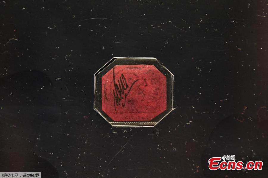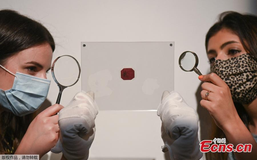 A picture of a British Guiana One-Cent Magenta which, according to previous sales, is the world's most expensive single stamp at Sotheby's auction house in London on April 28, 2021. (Photo/Agencies)