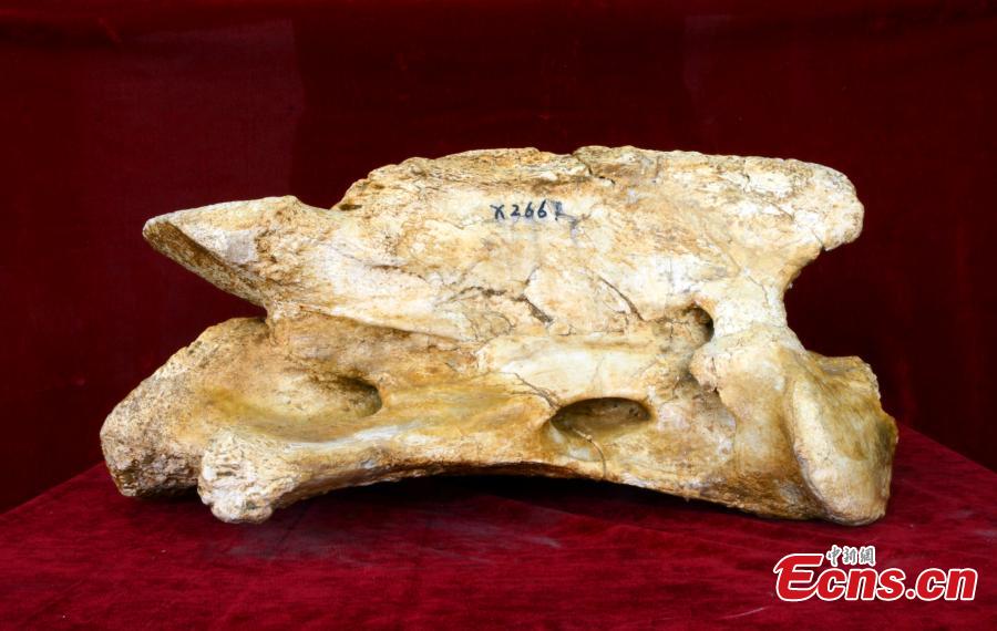 A huge axis of the giant rhino Paraceratherium linxiaense. (Filed photo provided to China News Service by Institute of Vertebrate Paleontology and Paleoanthropology, Chinese Academy of Sciences)