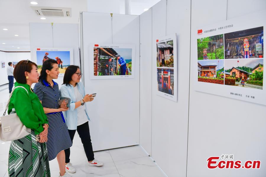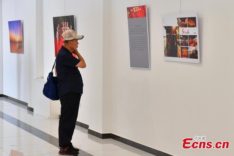 People look at pictures in the photo exhibition, which celebrates the 100th anniversary of the founding of the Communist Party of China (CPC) in Beijing, June 20, 2021. The photo exhibition, jointly held by the Chinese Folklore Photography Association and the Association of Chinese Local Art to celebrate the 100th anniversary of the founding of the CPC, displayed more than 100 works. (Photo: China News Service / Tian Yuhao)
