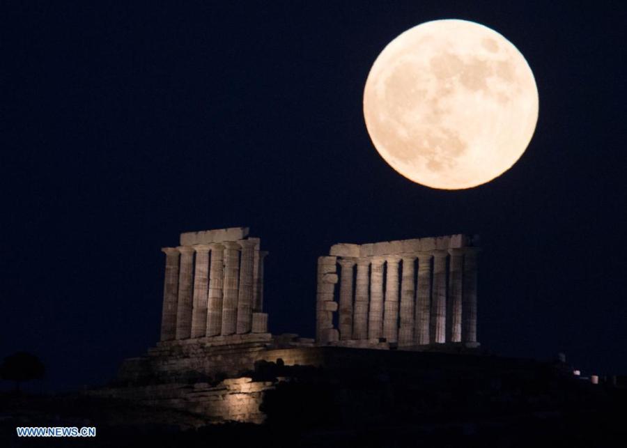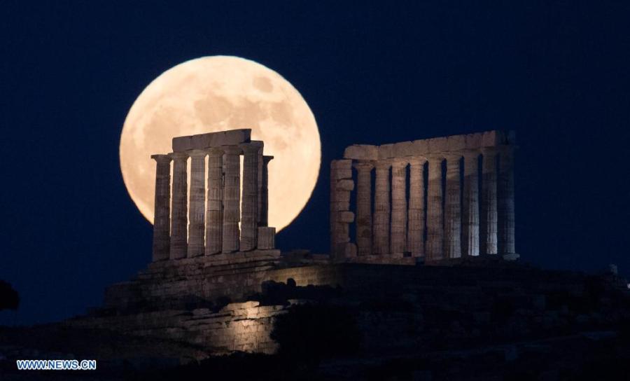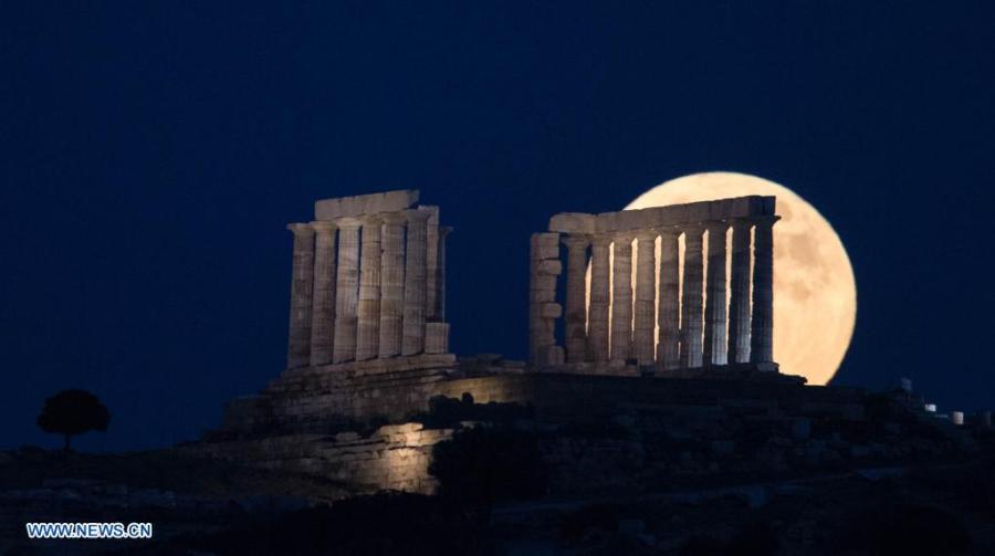 The full moon is seen rising over the Temple of Poseidon at cape Sounion, some 70 km southeast of Athens, Greece, on June 24, 2021. (Xinhua/Marios Lolos)
