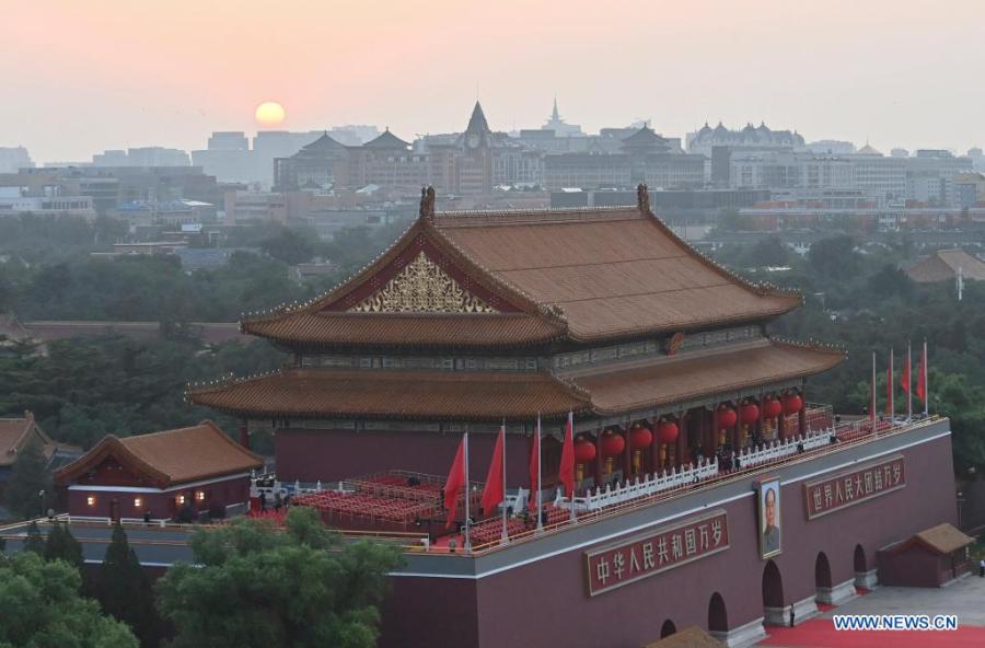 Attendees of a grand gathering celebrating the Communist Party of China (CPC) centenary pose for a group photo as the sun rises at Tiananmen Square in Beijing, capital of China, July 1, 2021. (Xinhua/Ma Ning)