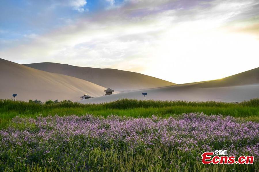 Photo taken at the beginning of July shows the Crescent Lake in Dunhuang, Gansu Province turns green and fresh in the desert after several raining days. The precipitation has increased in Dunhuang this year, making the Crescent Lake much picturesque. (Photo/ Wang Binyin)