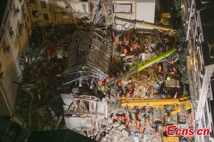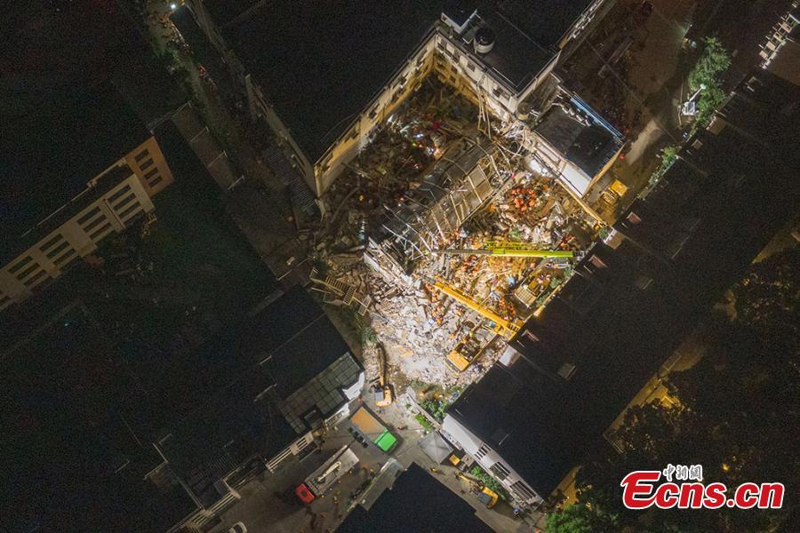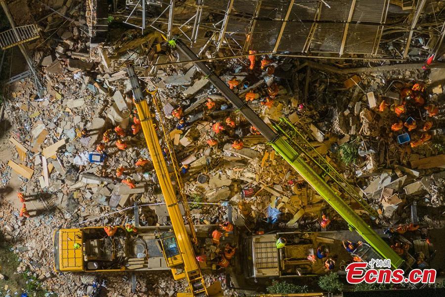 Rescuers work at the site of a collapsed building in Wujiang District, Suzhou City, Jiangsu Province, 3 a.m. July 13, 2021. (Photo/Yang Bo)