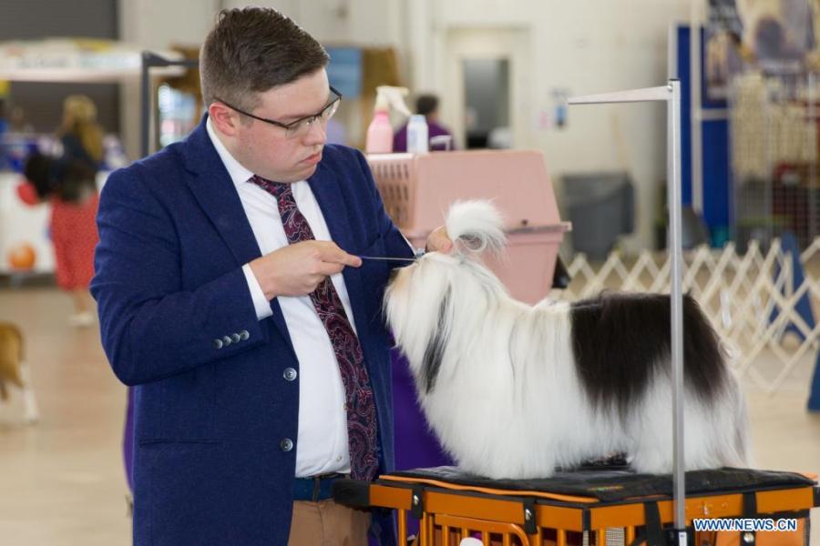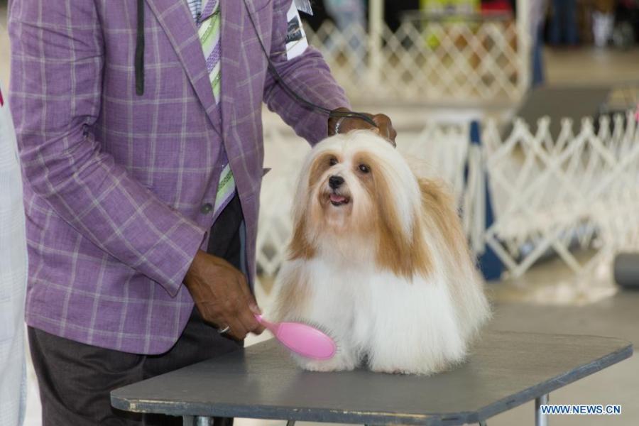 A man prepares a dog for a contest at a dog show in Dallas, Texas, the United States, on July 11, 2021. The four-day Dallas Dog Show which attracted many dog-lovers to participate ended on July 11. (Photo by Dan Tian/Xinhua)